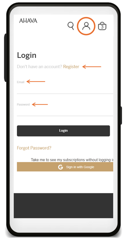 Add desired products to your cart, then click on the person icon in the top right corner of your screen and log into your account.