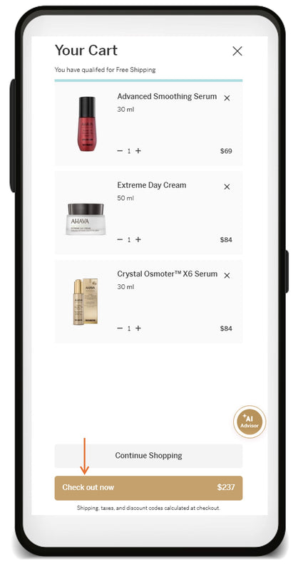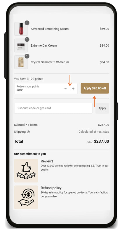 1. Use them as AHAVA currency: Add your skincare to your cart and proceed to checkout. Under the list of the products you are about to purchase, you'll find your point balance and their equivalent in dollars. By clicking on + or -, specify the number of points you wish to use and click on the button 'Apply $XX off'. Note multiple advantages: To enjoy your rewards to the maximum, you are free to apply another discount code in the field under.